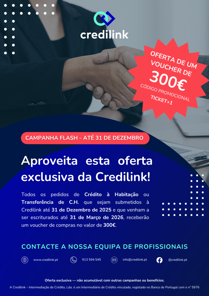 • Todos os pedidos de Crédito Habitação ou Transferência de Crédito Habitação realizados pelos utilizadores TICKET+, que sejam submetidos à Credilink até 31 de dezembro de 2025, e que venham a ser escriturados até 31 de março de 2026, receberão um voucher de compras Pingo Doce ou FNAC (ou equivalente) no valor de 300€ (não acumulável com outras promoções).